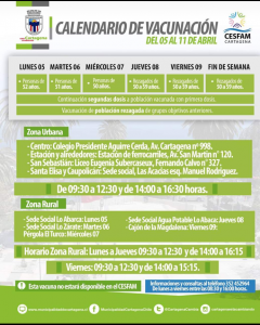 La Municipalidad de Cartagena, informa a los vecinos y vecinas el calendario de vacunación del 5 al 11 de Abril.