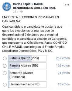 Recordamos a los electores de Cartagena que pueden votar y dar a conocer su opinión hoy durante todo el día en www.tvcartagena.cl y en Radio Bendiciones Chile en Facebook.